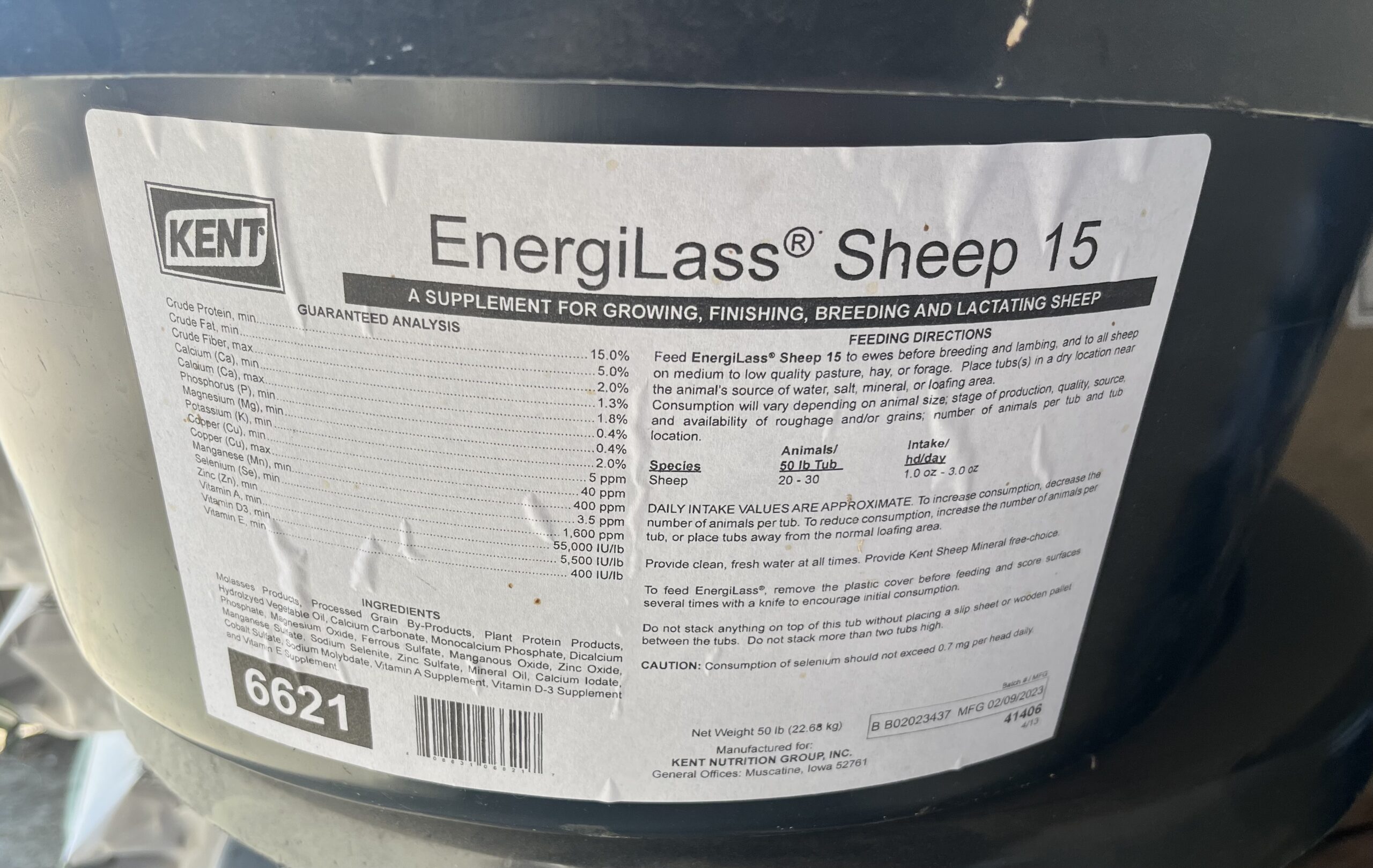 Feed EnergiLass Sheep 15 to ewes before breeding and lambing and to all sheep on medium to low quality pasture, hay, or forage. Place tub in a dry location near the animal’s source of water, salt, mineral, or loafing area. Consumprion will vary depending on animal size; stage of production, quality, source, and availability of roughage and/or grains; number of animals per tub and tub location.
