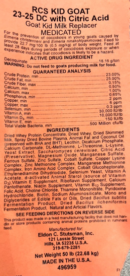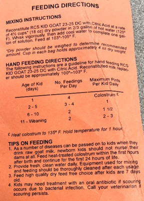 Mixing Instructions: Reconstitute RCD Kid Goat 23-25 DC with Citric Acid at a rate of 4 1/2 cups dry powder in 2/3 gallon of hot water. Whisk vigorously, then add cool water to complete one gallon of solution. Feed at 103-105 degrees Fahrenheit.