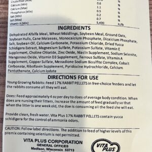 The 17% Rabbit Pellet is for young growing rabbits. Feed the 17% rabbit pellets in free-choice feeders and let the rabbits consume all they will eat.